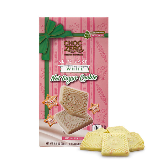 The perfect sugar free Christmas Candy: Not Sugar Cookie keto chocolate bars! Each piece of our zero sugar added white chocolate is filled with crunchy low carb cookies dyed naturally with pastel pinks and greens for a visual treat. Santa definitely won't miss his sugar cookies with these naturally sweetened chocolates!