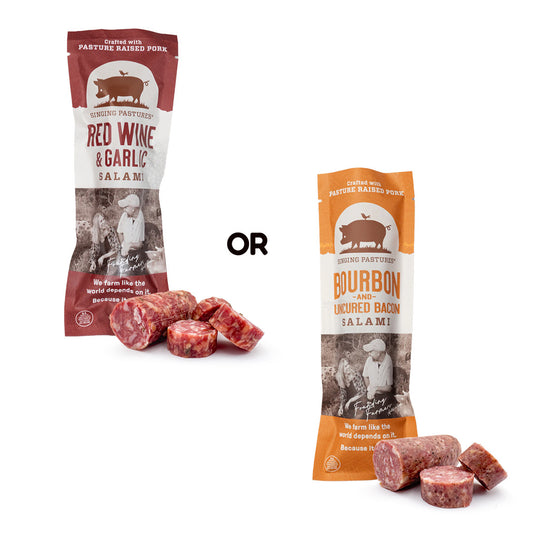 or those who crave the bold and indulgent, this salami is the embodiment of Southern culinary charm, a fusion of two beloved flavors – bourbon and bacon. We start with coarse ground 100% pasture raised pork and infuse it with rich, savory bacon and bourbon. The bourbon adds flavor notes ranging from bold oak to sweet & spicy aromatics, lending a sophisticated depth. It's a harmonious blend that will dance on your taste buds and leave you craving for more.Pair it with a smooth bourbon whiskey or enjoy it alongside a glass of your favorite craft beer. This salami may leave you with the feeling of a cozy gathering on a front porch in the heart of the South.