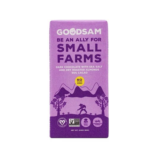 Ingredients: Dark Chocolate (Cacao Mass*, Allulose^, Cacao Butter*, Sunflower Lecithin^), Almonds, Sea Salt. *Organic and Direct Trade; +Organic; ^NON-GMO
